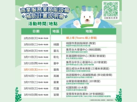 為協助商業服務業盤點高耗能設備、降低用電成本,經濟部持續推動 115 年商業服務業節能設備補助計畫。本年度說明會除補助制度說明外,新增「用電健檢」專人諮詢服務,透過用電資料分析,協助業者更精準掌握用電狀況與設備吃電關鍵。